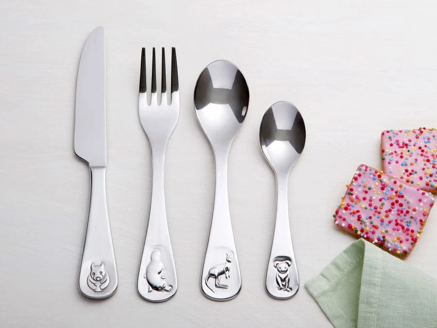 Kids will love this Koala & Friends children’s cutlery set. The set includes a knife, fork, spoon and teaspoon, and features easy-grip, oversized handles, perfect for little hands. Match it with our other children’s cutlery set for a whole collection of charming animal designs.
